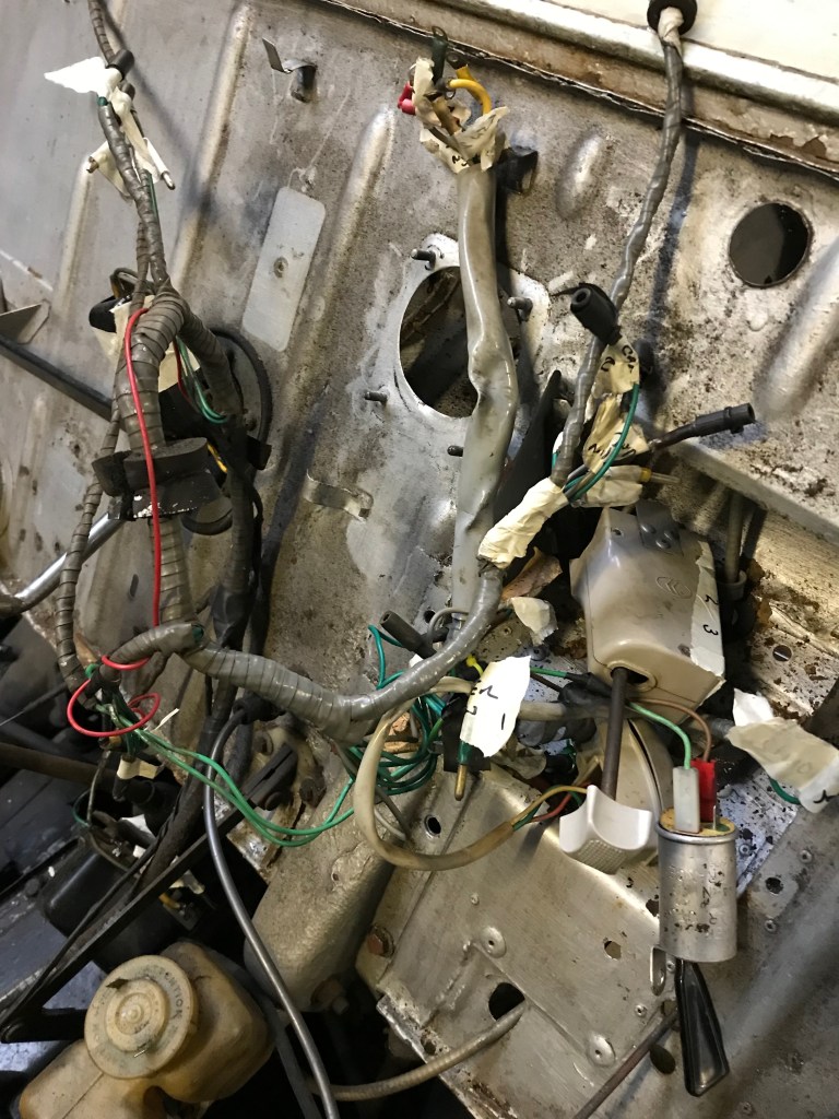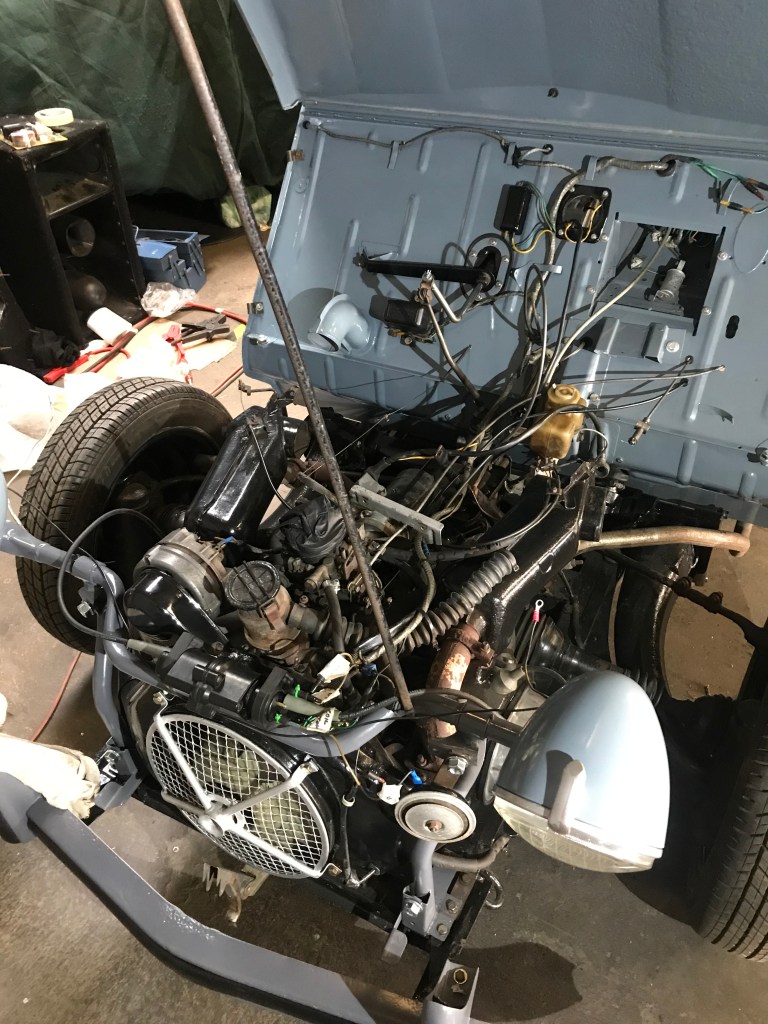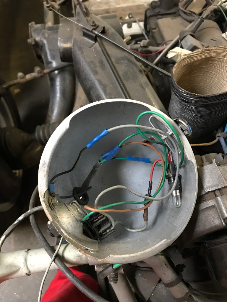 Lights – I must have spent days working out what was wrong with the lights. I had parking lights – (these are the sidelights lit either left or right depending on which position the separate sidelight switch is on) , but no dipped beam. When I put the main beam on, both the dipped and main filaments were lighting up. Oddly, there was a scotch connector at the front which joined 2 of the 4 wires that connect to the lamp bar. These 2 wires were for each of the sidelights – one left and one right, so how they operated independently as parking lights is a mystery that will never be solved. 6 wires come out of the lamp bar. 3 of these had been snipped off and there were wires leading from one headlamp to the other which had been added at some point…