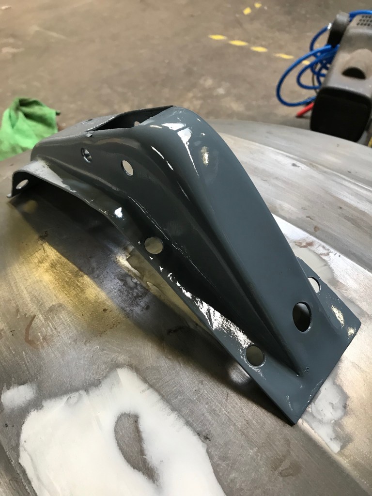 Lamp bar – cleaned and sanded as best I can. There was lots of thick brush coated paint to flatten off. I did think about getting it back to bare metal with the wire bush and angle grinder, but there are wires poking out of its various orifices (orifi?) and it’s altogether an awkward shape to deal with, so will take an age to strip and since most of it is hidden when the bonnet is down, I’m taking the less onerous option. This will also get a coat of the grey AC140 paint before re-fitting. No picture of this as it’s still a work in progress