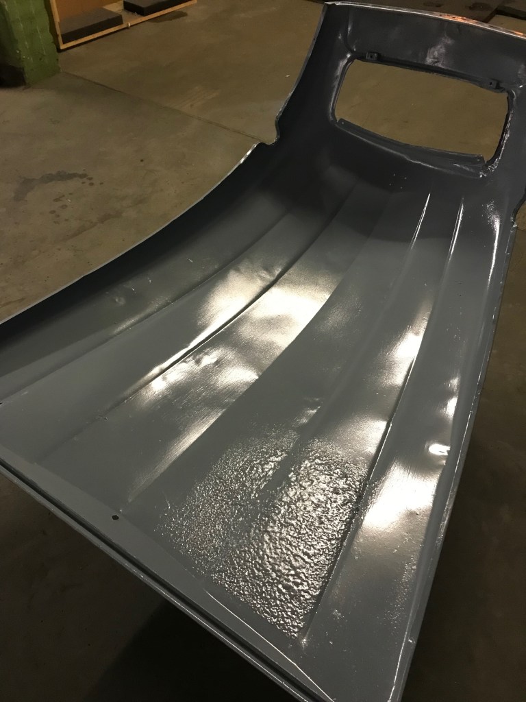 Bonnet – I painted the inside of the bonnet – just for completeness really, as most of the underside will be covered by the soundproofing. Soundproofing which looks like a bit of old carpet underfelt and probably does nothing to dampen any noise, but will be re-instated. The bonnet had previously been brush painted silver, so was just flattened off with some 250 grit wet and dry before painting with top coat. You can see a bobbly bit where the battery sits close to the underside of the bonnet. This looked like black tar and has been part of the bonnet for a long time. I wonder if it’s a factory finish – put on to protect the paint from battery fumes? Someone may know…