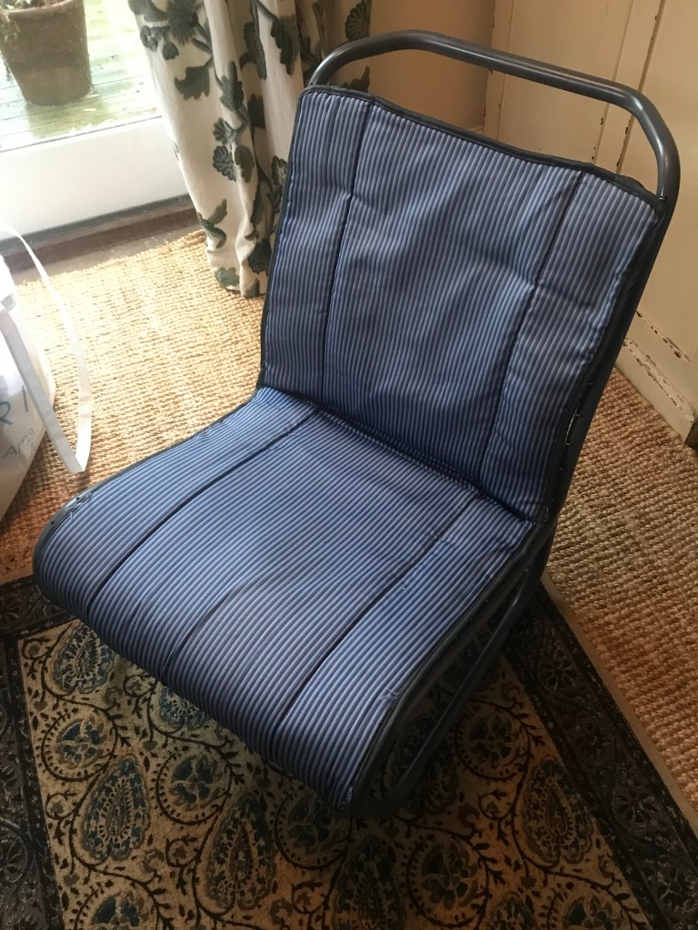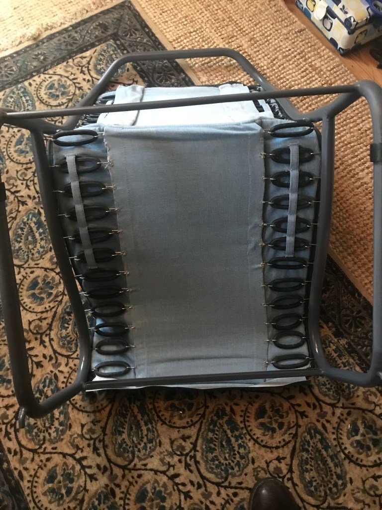 A naked seat frame – not much to it is there…? New rubber bands and laundered coversThe finished article – splendid