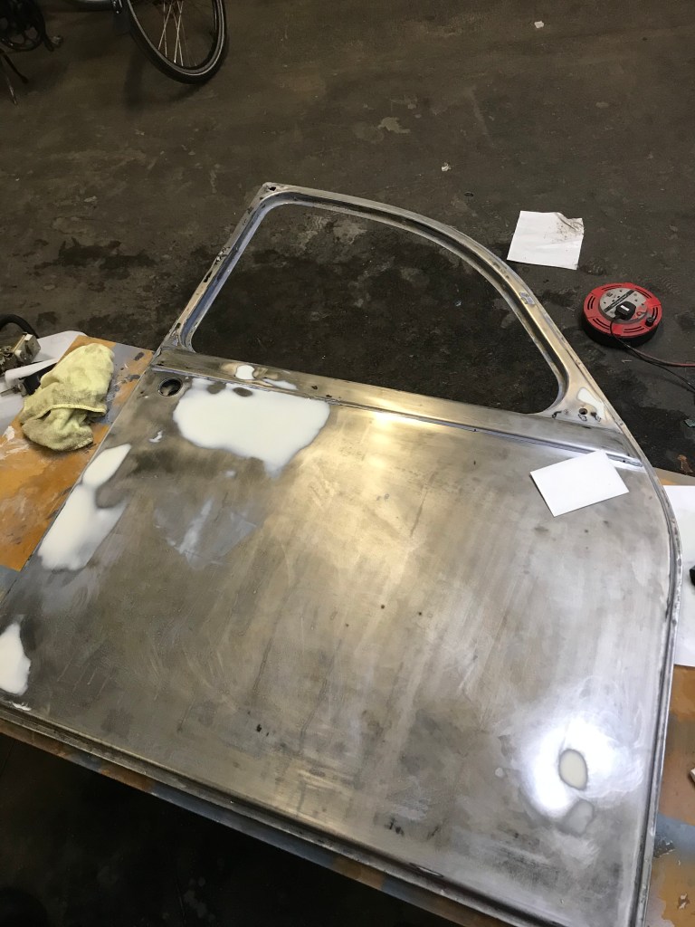 Vent flap – I sprayed far too much paint on this, which left it looking very wrinkly. This was after I’d already painted it and then dropped it on the gritty workshop floor in my haste to put it somewhere safe while the paint dried properly. It wrinkled mostly in the dimples where the inner and outer panels are spot welded together, so I have flattened it off with some 800 grit wet and dry paper, ready to be painted again. I’ll do this along with the driver and passenger doors, both of which need quite a bit of work before they will be ready for paint.