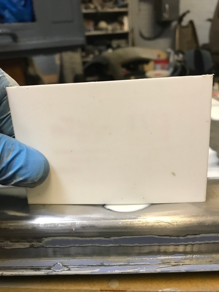 For the uninitiated, a here’s a bit of filler about filler. Body filler is a resin based 2 part product, the filler which comes in a tub or tin and a tube of hardener. Mix the 2 parts in the prescribed ratio – a golf ball sized lump of filler to a pea sized piece of hardener. Mix well – until all the streaks of hardener have blended in with the filler and apply. I use an ‘onion skin’ pad to mix the filler on, but anything clean and smooth will do and then apply it with a plastic spreader. It’s not easy to get the right amount on first time, you need to put just a bit more on than is needed and you need to get it as flat as possible, without streaks and lines and you need to do all this before it goes off, which means you have about 3 or 4 minutes to spread it out. Once it’s on, leave it to dry. Don’t be tempted to keep fiddling with it, you will make a hash of it and get annoyed.
