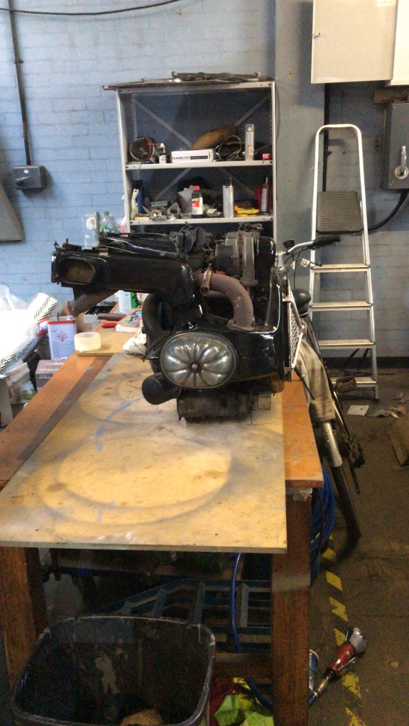 Heave out the engine and place on the bench. I’m making this bit sound easy because it is. The engine is quite heavy but easily lifted by 2 people. I had to move it on my own, which was a bit of a struggle but doable.