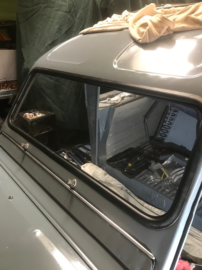 Next on the list was the side windows. These are fitted with a chrome strip which sits in the middle of the seal and expands it slightly holding it in place. With the fixing strip removed, I fitted the seal to the window aperture and then squeezed the glass in. After an hour of swearing and cursing, I finally managed to get them in place. The ‘chrome’ fixing strip has broken into many small pieces, so I’ll need to get some more. It looks as if it’s the same profile as an old Mini windscreen, so that’s what I’ll get.