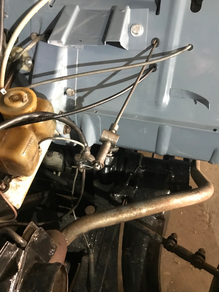 Master cylinder fitted to the brake pedal assembly and fitted to the bulkhead. This job should have taken about 10 minutes but of course I had some glitches to sort out. The new bulkhead and toe board panels were not a matched pair. The bulkhead was for a LHD suspended pedal box 2CV and the toe board was for a LHD chassis mounted pedal box 2CV, so I had to cut a hole in the toe board through which the master cylinder could be fed through and then the pedal box could be bolted to the bracket which is fixed to the bulkhead. I had to drill 6 holes for the bracket and cut out a square section to make room for the master cylinder. Anyway – it took a couple of hours to sort it all out – another hour or so to bleed the brakes (not easy single handed) but I do now have a firm brake pedal and brakes. I think.