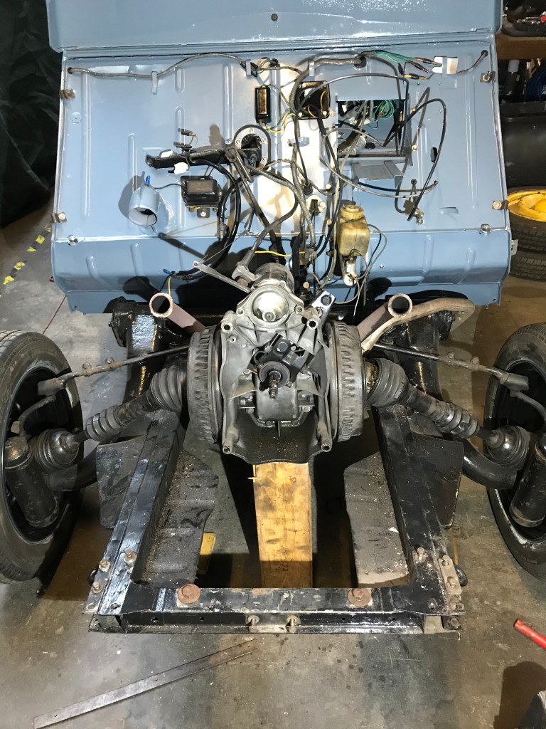 Pete, Steve and I lifted the body back onto the chassis and with a bit of shuffling around, managed to get a couple of bolts in place to keep the 2 halves of the 2CV sandwich together. I had a look down each side and at the rear where the chassis runs under the back of the van and all of the other bolt holes are lined up nicely. A huge relief, given how much re-work was done on the front of the van – thank god for the chassis jig – I would have been in a right pickle without that. Here it it is then, starting to come together