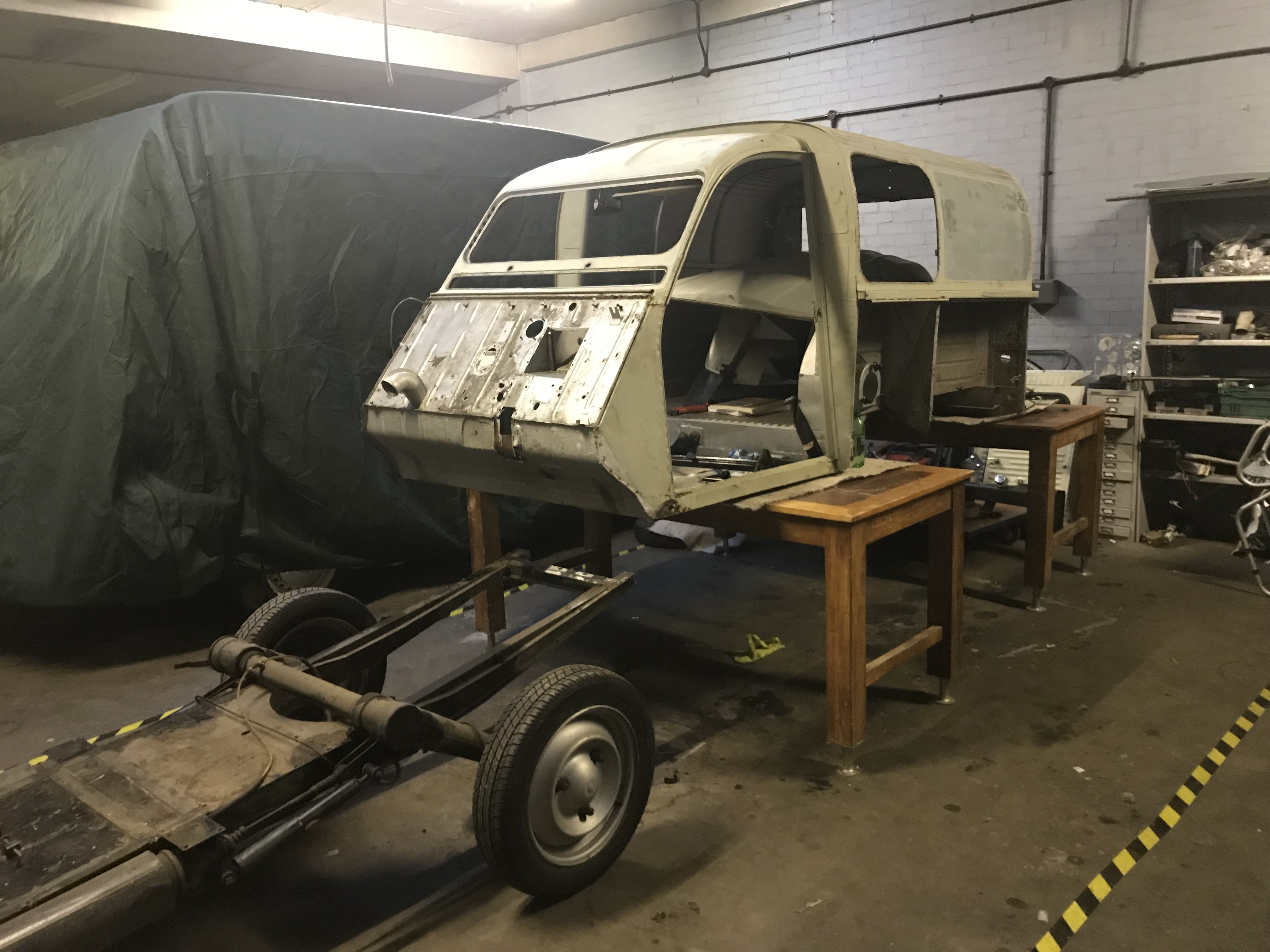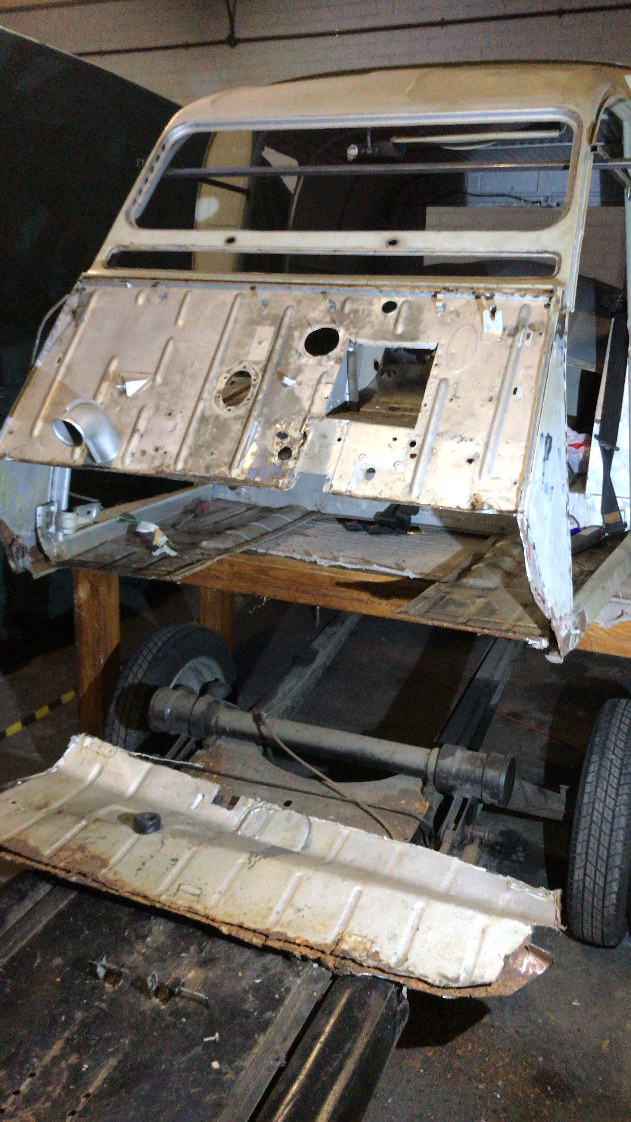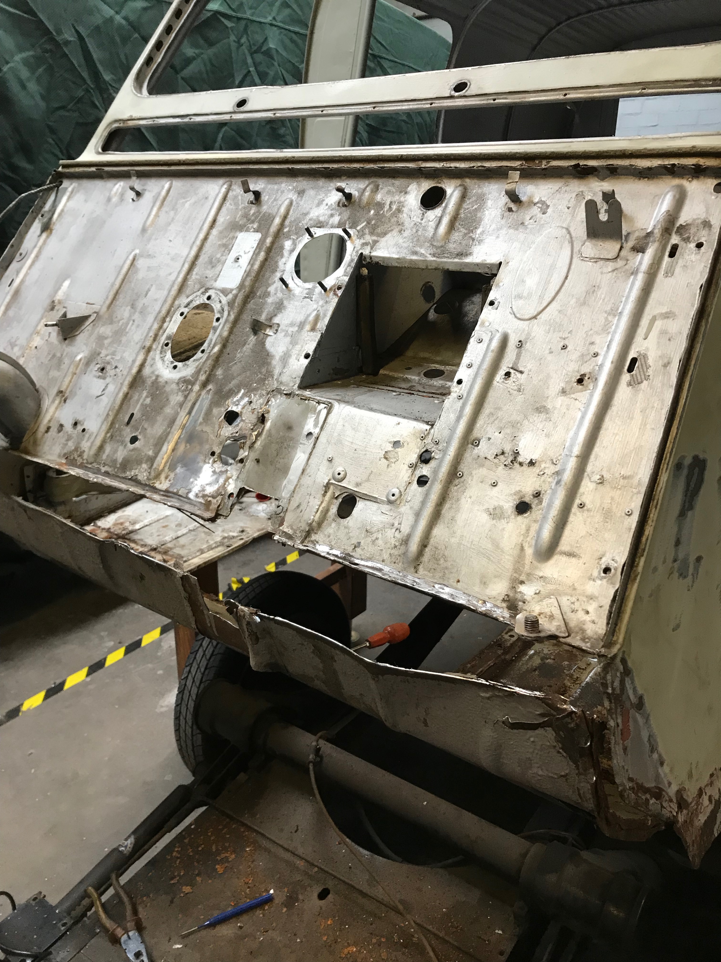 This is the bare shell lifted off the chassis Luckily it’s not very heavy and with the help of friends Pete and Steve (who I’d invited down to the workshop to see how I’m getting on) peeled the body off the chassis and sat it on a couple of tables. This enabled me to wheel the chassis, complete with engine, gearbox and wheels out from underneath the body so we could get a better look at it. ‘It’s not too bad’ declared Pete. Steve’s silence was palpable. I began to question my own sanity, wondering how on earth I was going to fix it all. Having restored a Triumph Spitfire a few years ago, I knew that there were horrors lurking underneath the benign exterior. Like most cars, the 2CV rusts along the seams and from the inside out, so by the time you see the signs of rust showing, its already well established and the damage can be quite extensive. All the old rust really has to be cut out and replaced with good metal. It’s no good just covering it up.