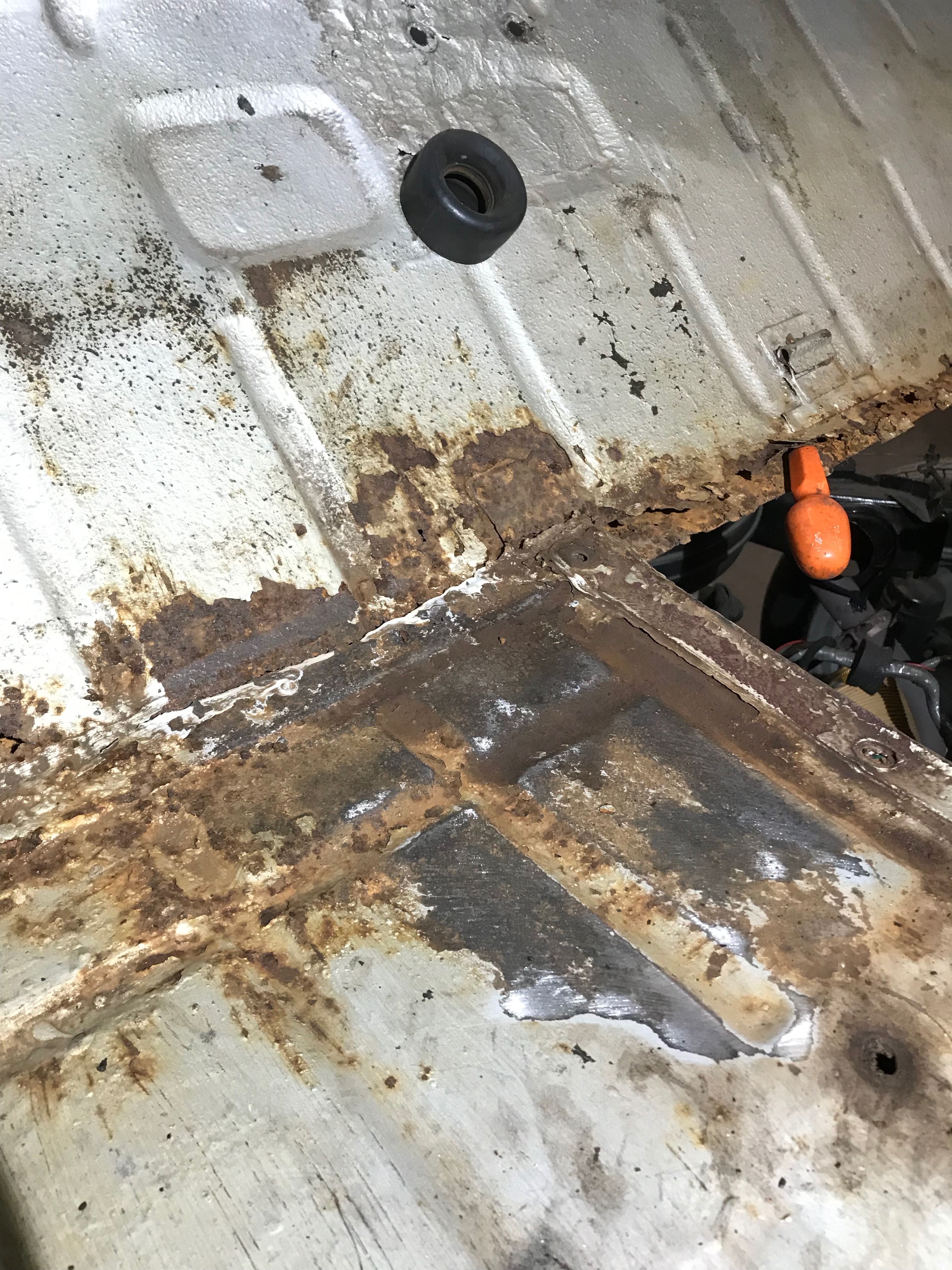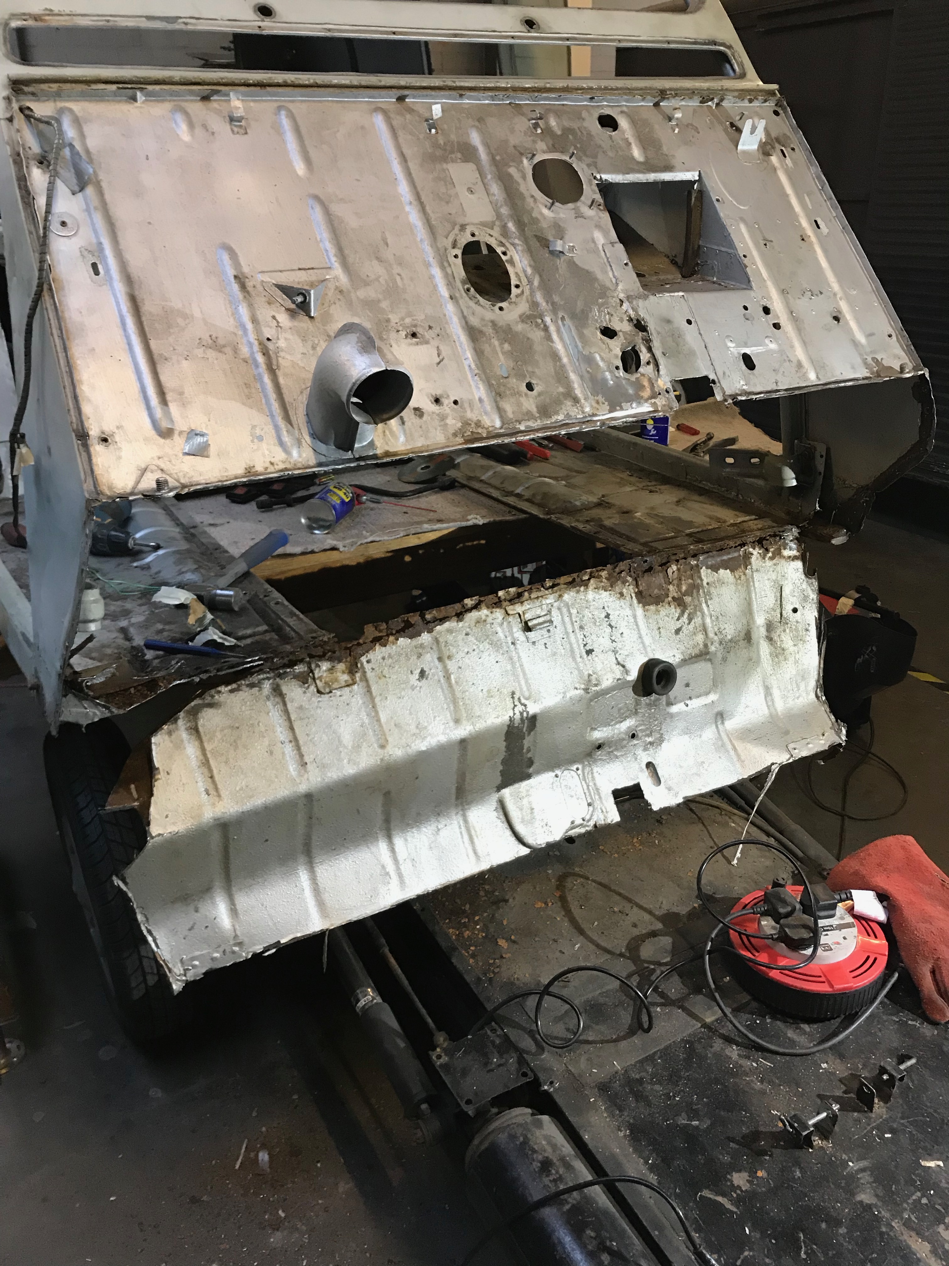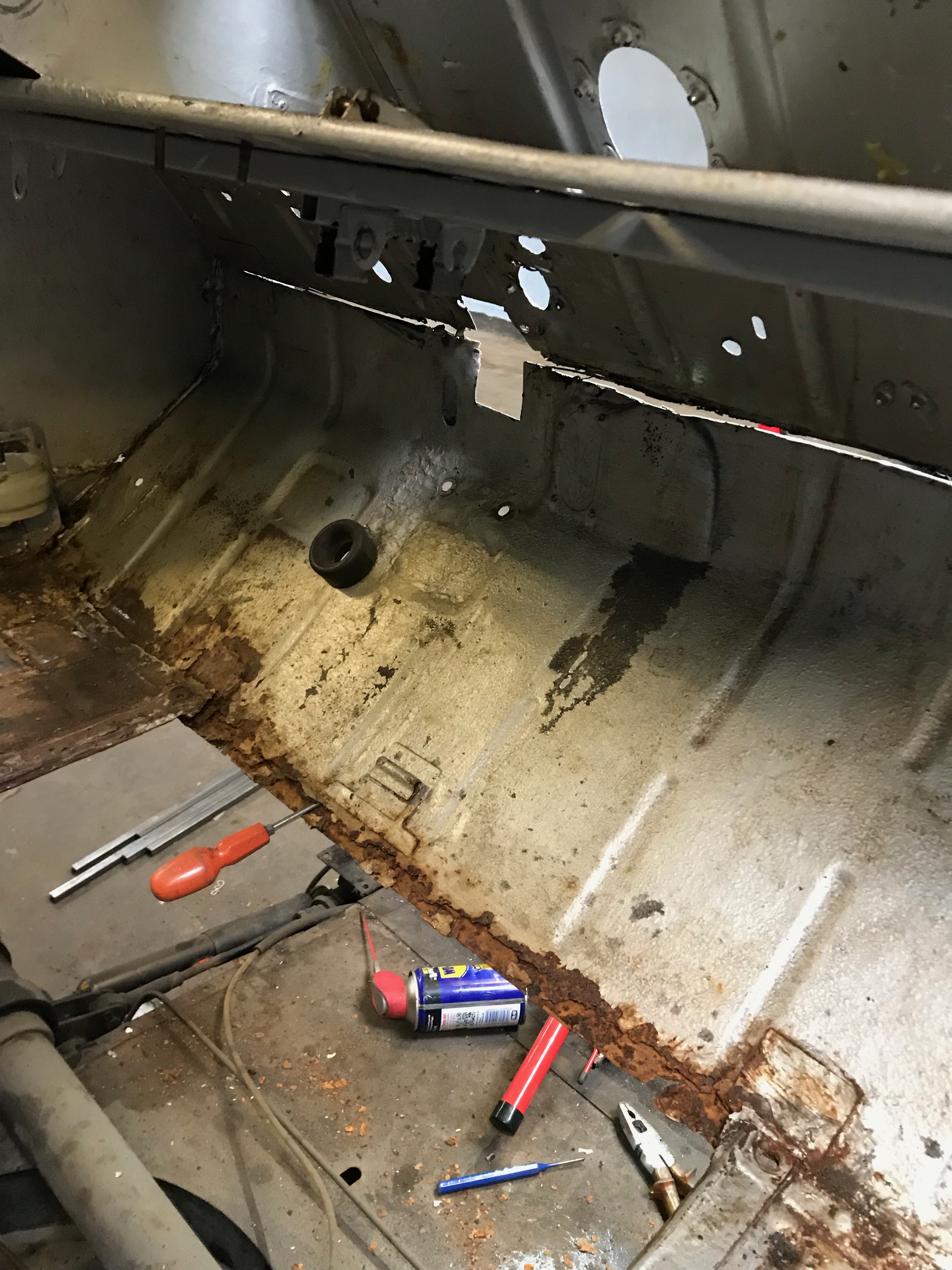 I was expecting the body to chassis bolts to be properly rusted in and had all sorts of thoughts about cutting them off with the angle grinder, hacksaw, drilling and re-tapping. However, they all came out easily except three, which were holding the bulkhead and front of the floors to the chassis. These simply remained screwed to the chassis as the 3 layers of friable crusty steel around them broke away like puff pastry. With all of these out, the only thing holding the body on was the brake master cylinder. Mr Haynes says ‘undo the brake pipes, 6 carrier bolts, fluid reservoir, pedal assembly and simply withdraw the master cylinder through the bulkhead into the car. I couldn’t. The previous owner had at some point decided that 6 M8 nuts and bolts were not sufficient to hold the master cylinder carrier onto the bulkhead and had also welded it in place. I cut it out with the angle grinder and spent an hour cleaning off the welds rather than pay out £45 for a new carrier. Deeply satisfying.