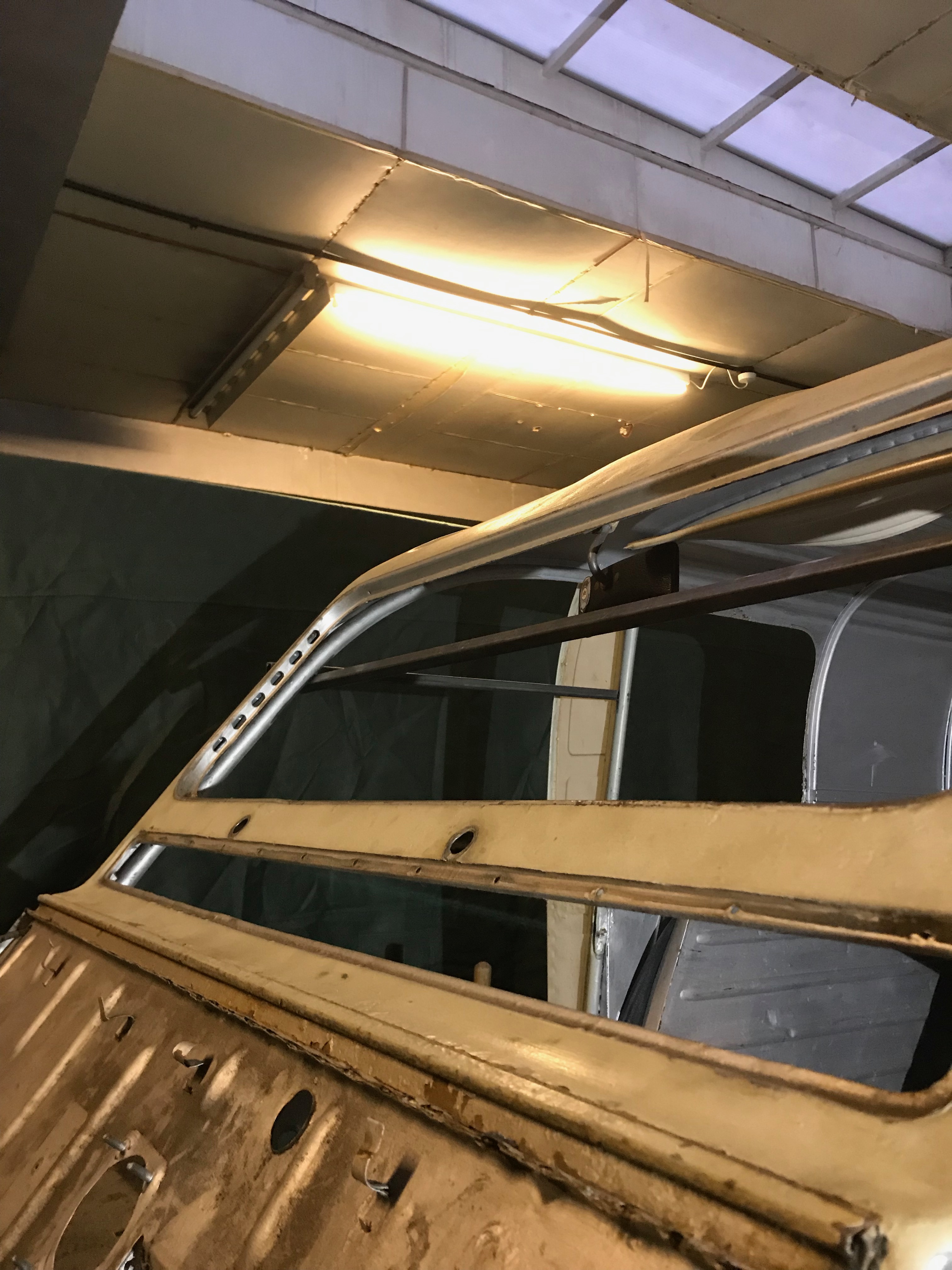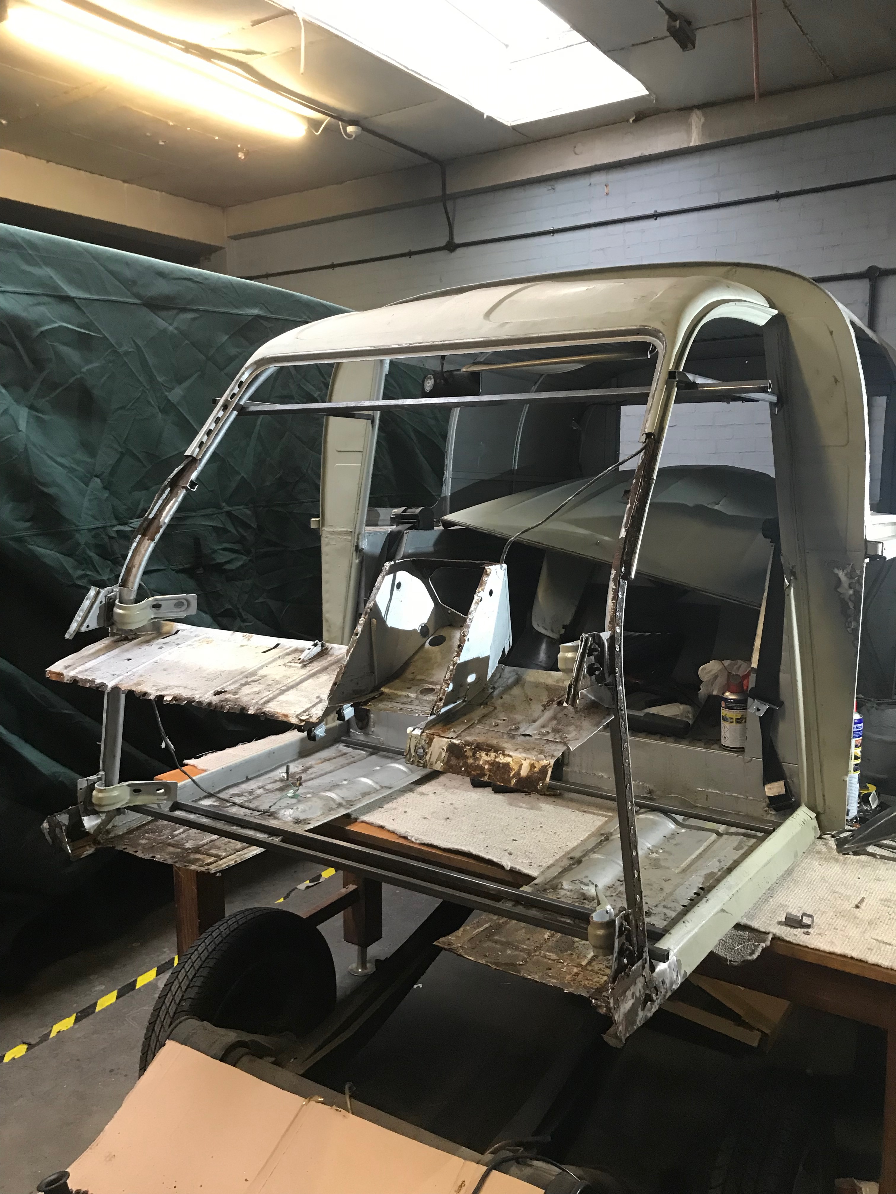 Here’s the firewall and screen out.  Next job is to clean up the A posts so I can weld the new panels in.  I’ll chop out the worst bits and mig in some patches where I need to.  I don’t want to separate the sills from the A posts as I think the whole thing will spring apart and I’ll spend forever trying to line it all up again.