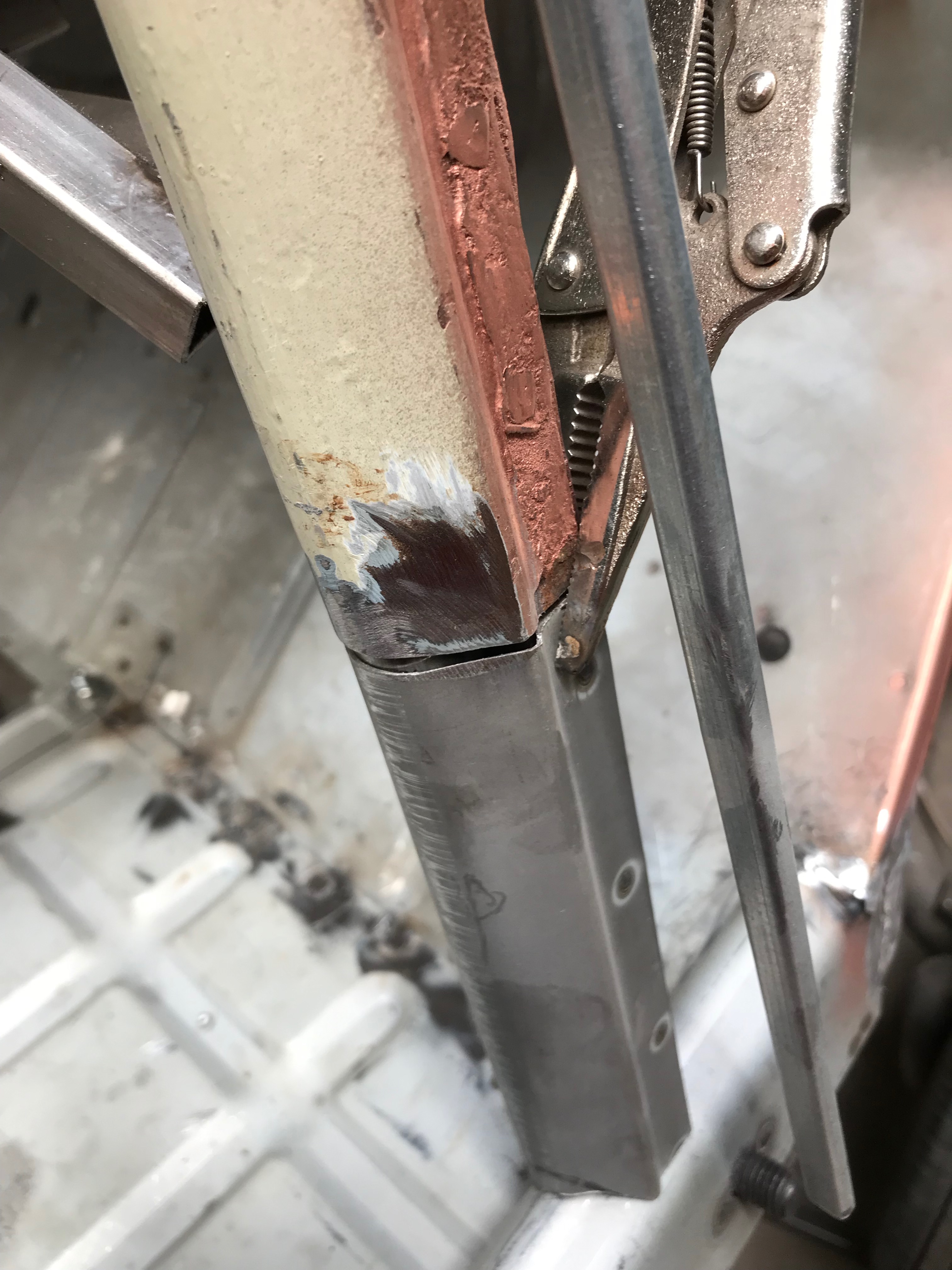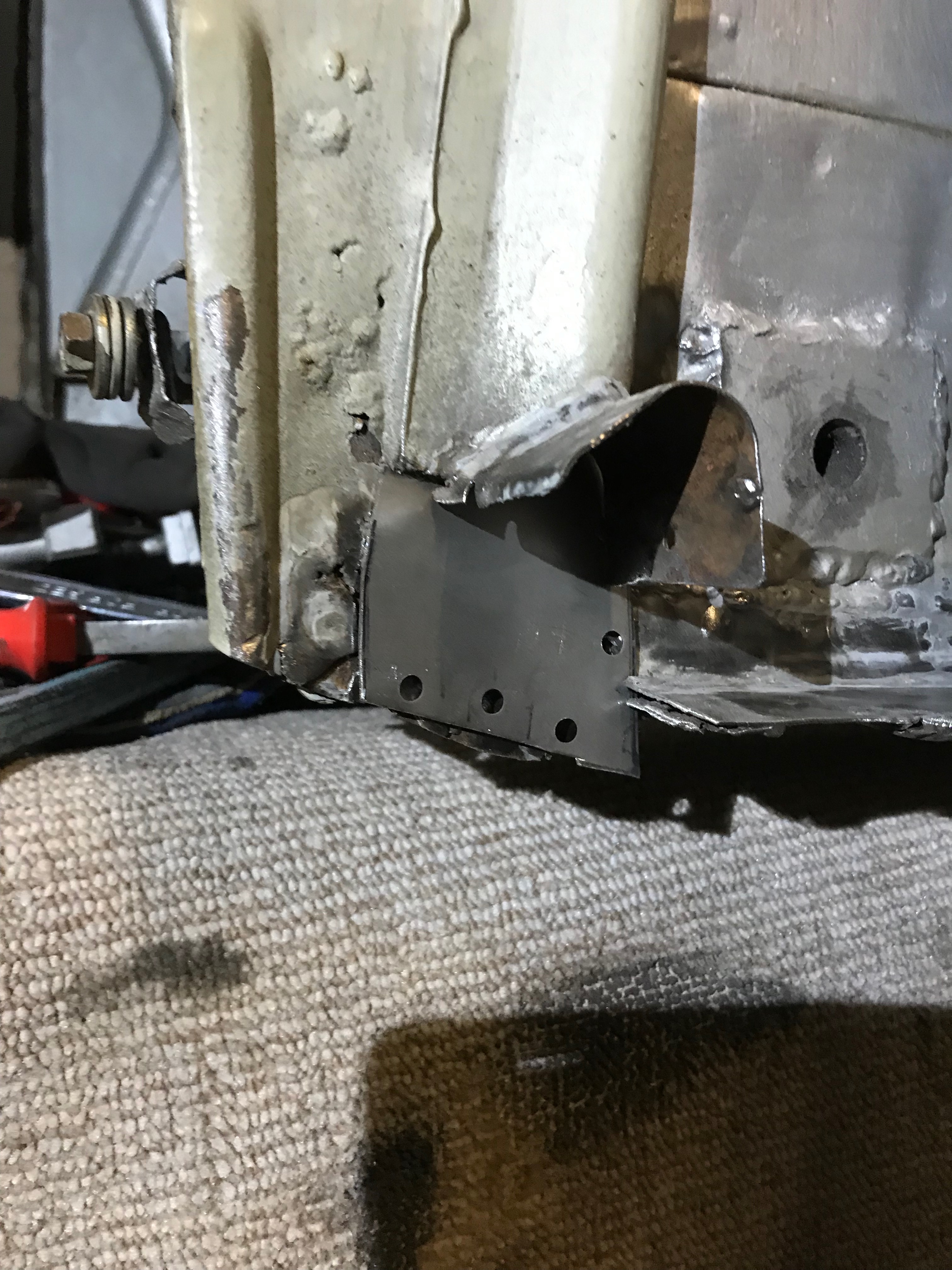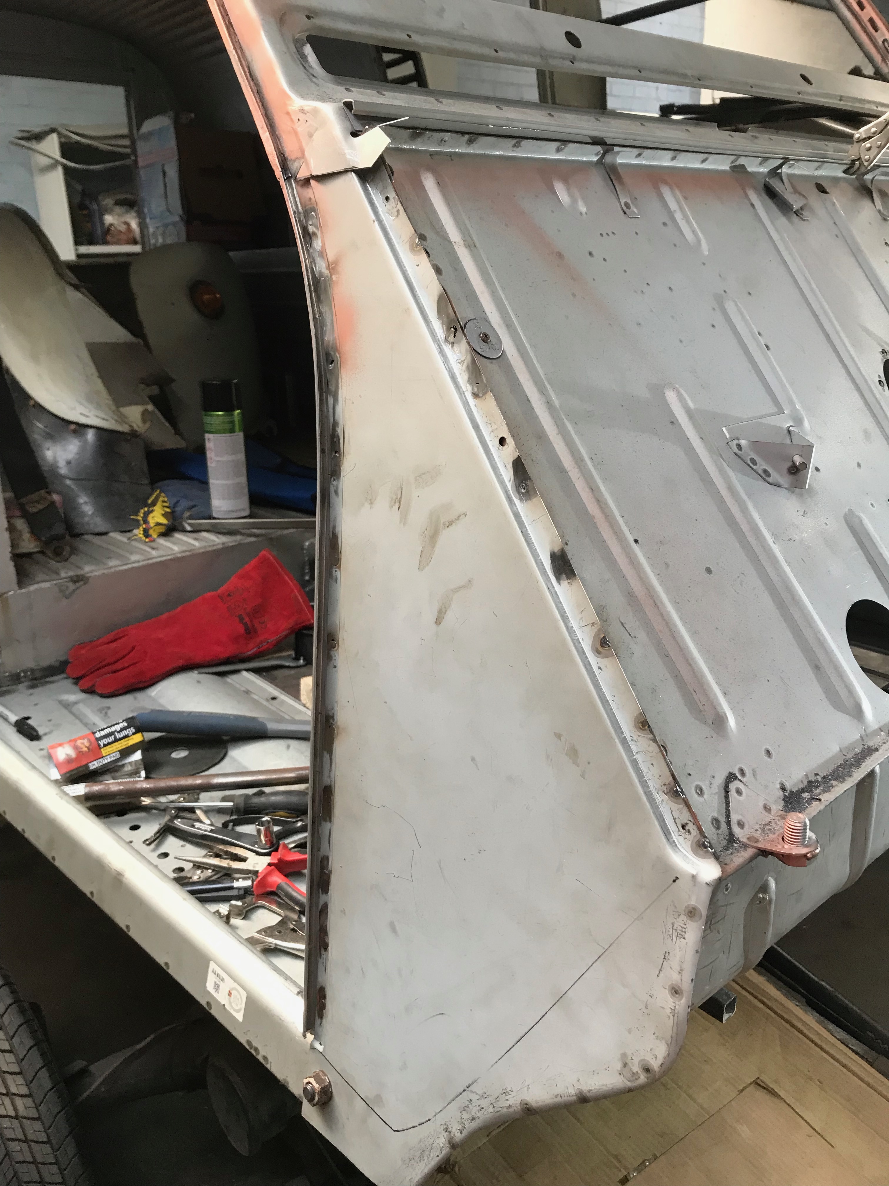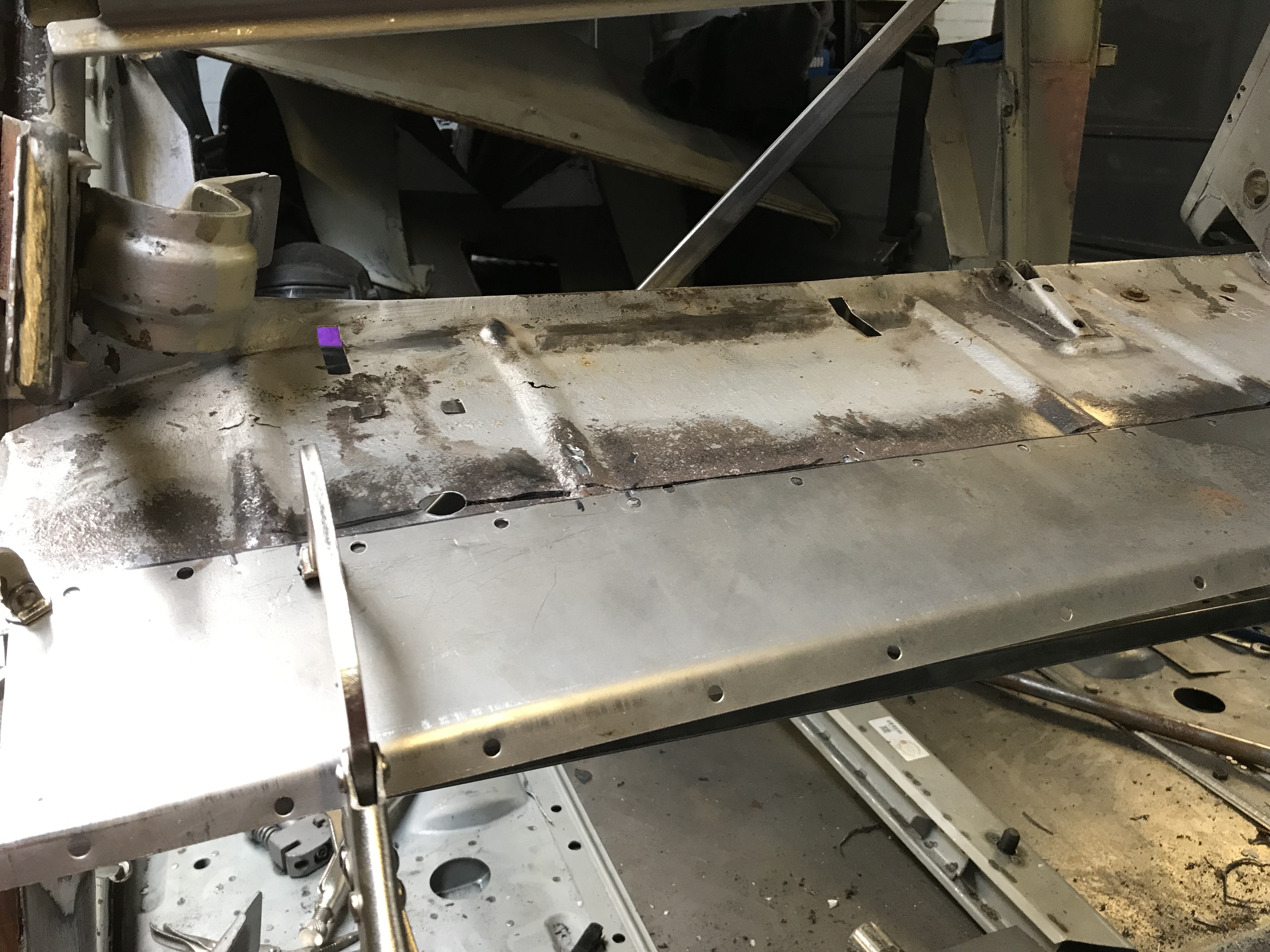 Lastly, I dressed the join where the sill slots into the toe board and have seam welded it. This was tricky to weld and turned out a bit ‘blobby’ where I attempted to run a nice fillet along the join. There’s a big gap here, it would not have welded very well ‘as’ is’