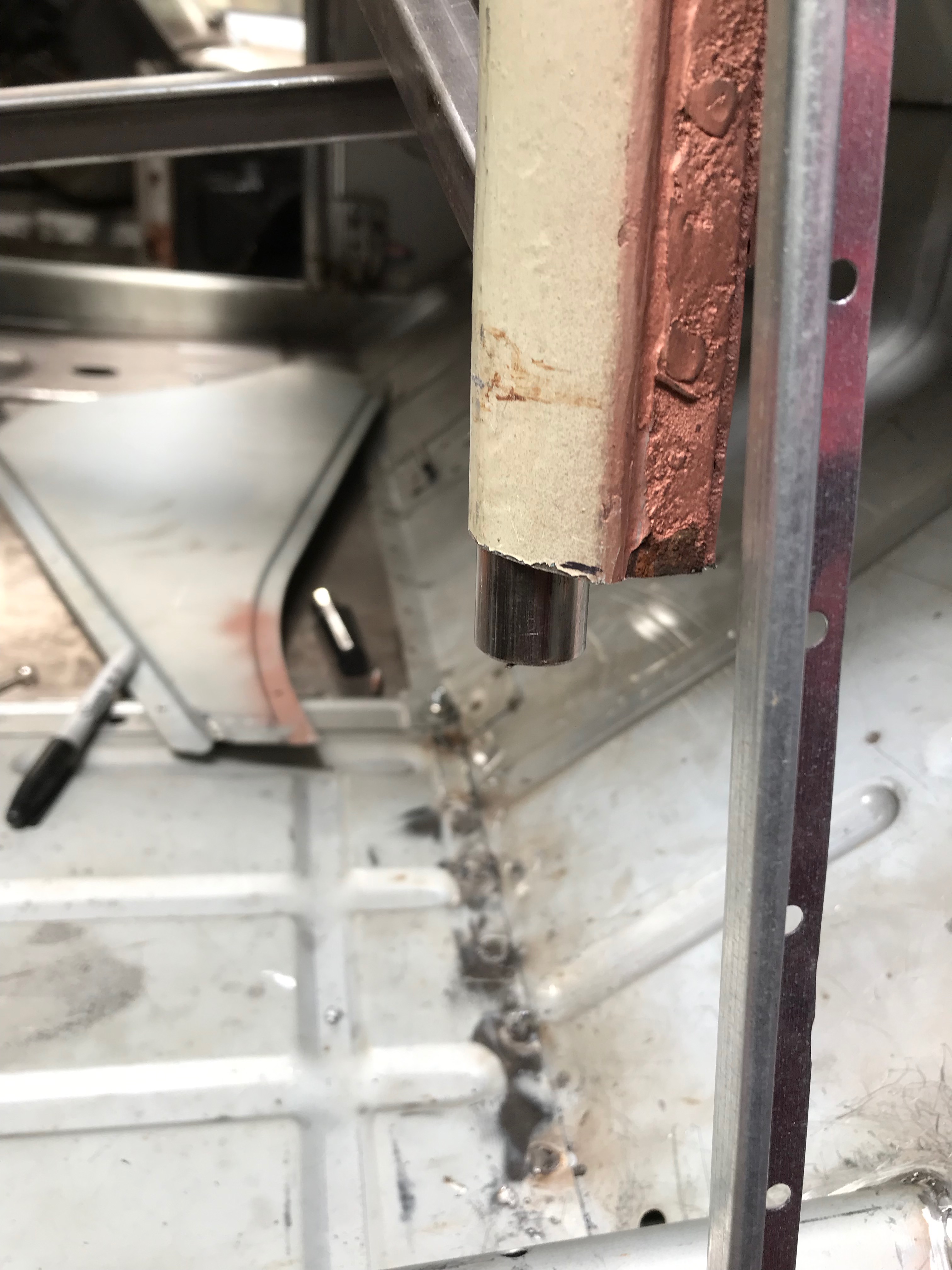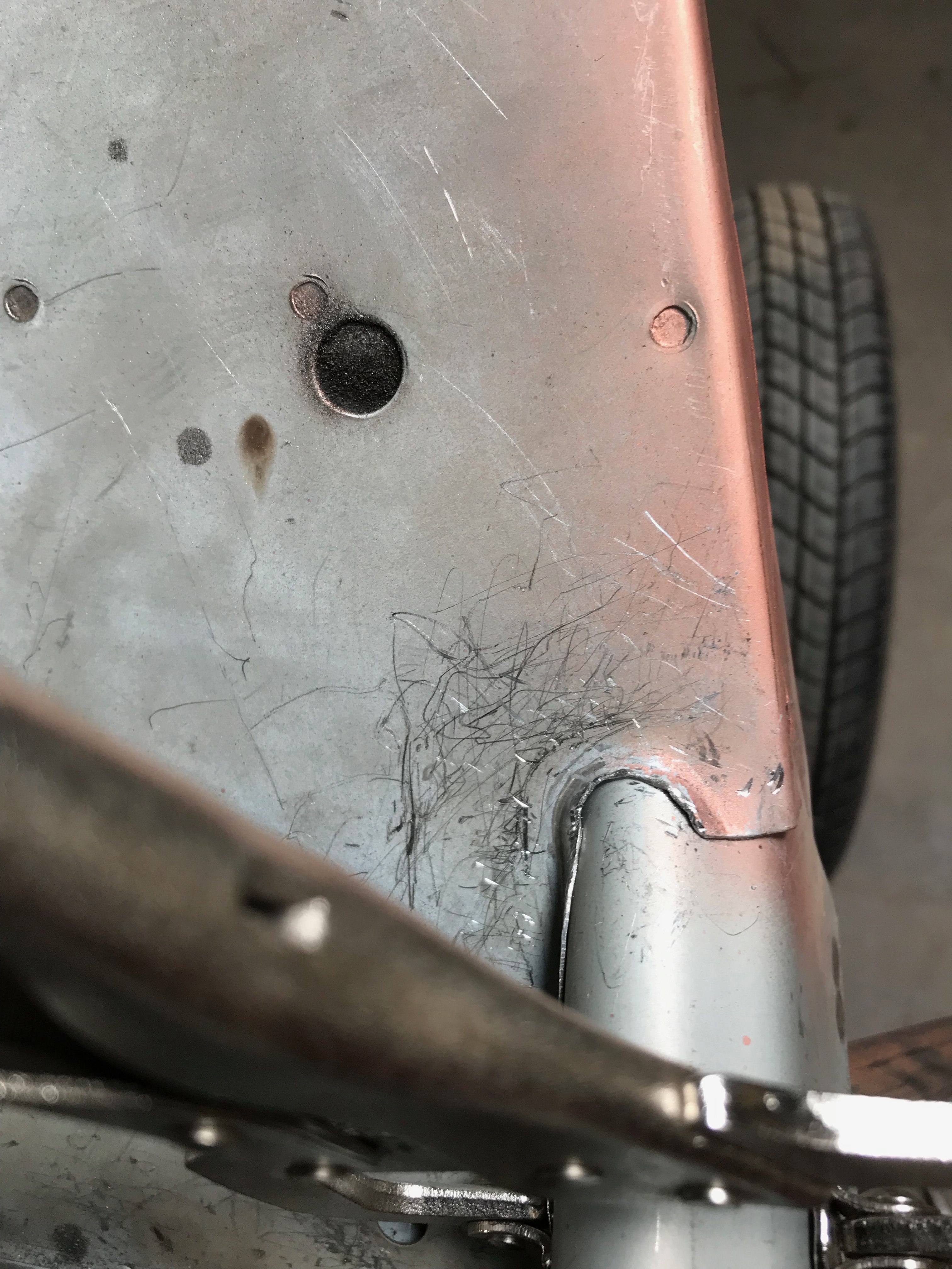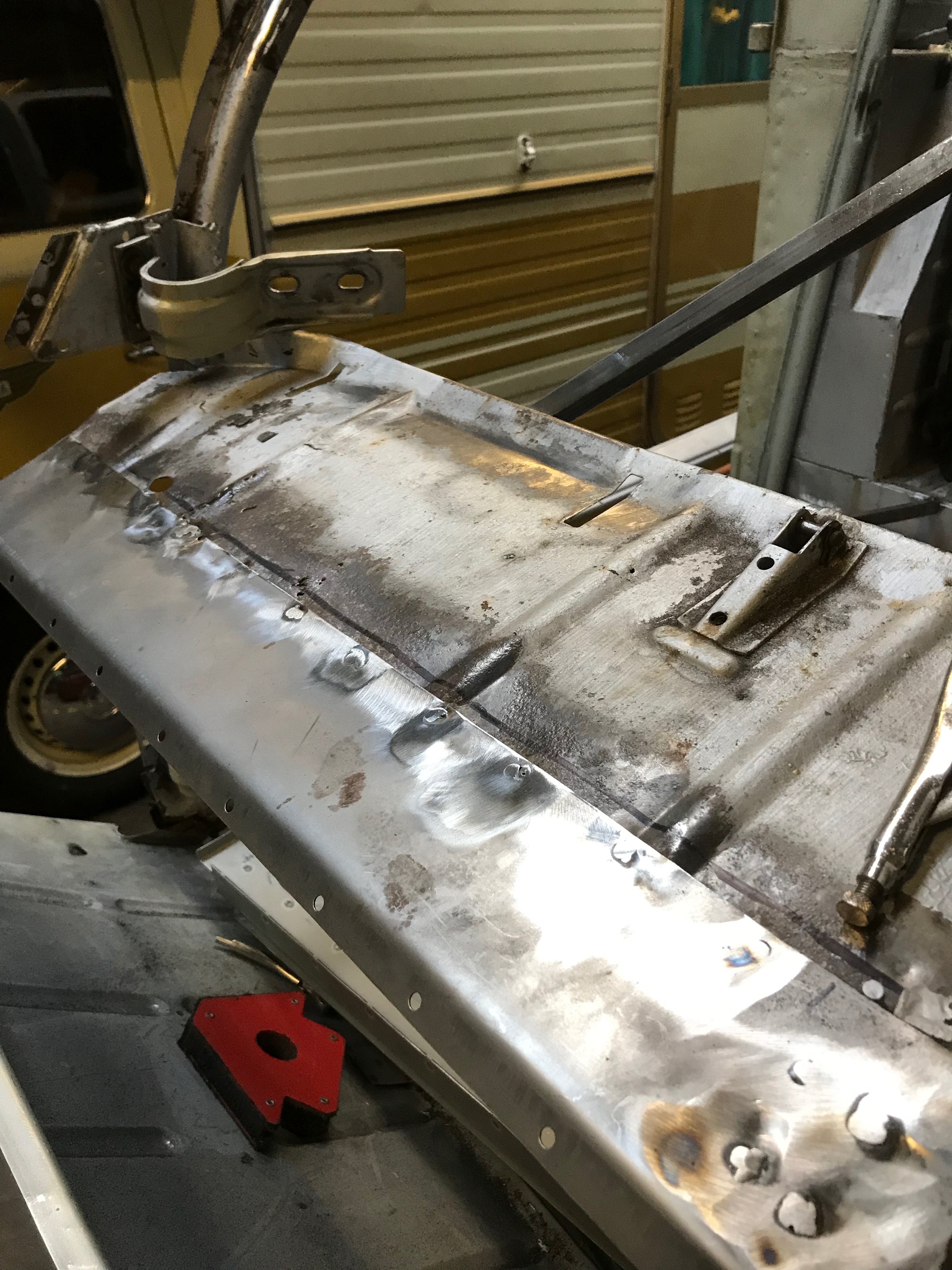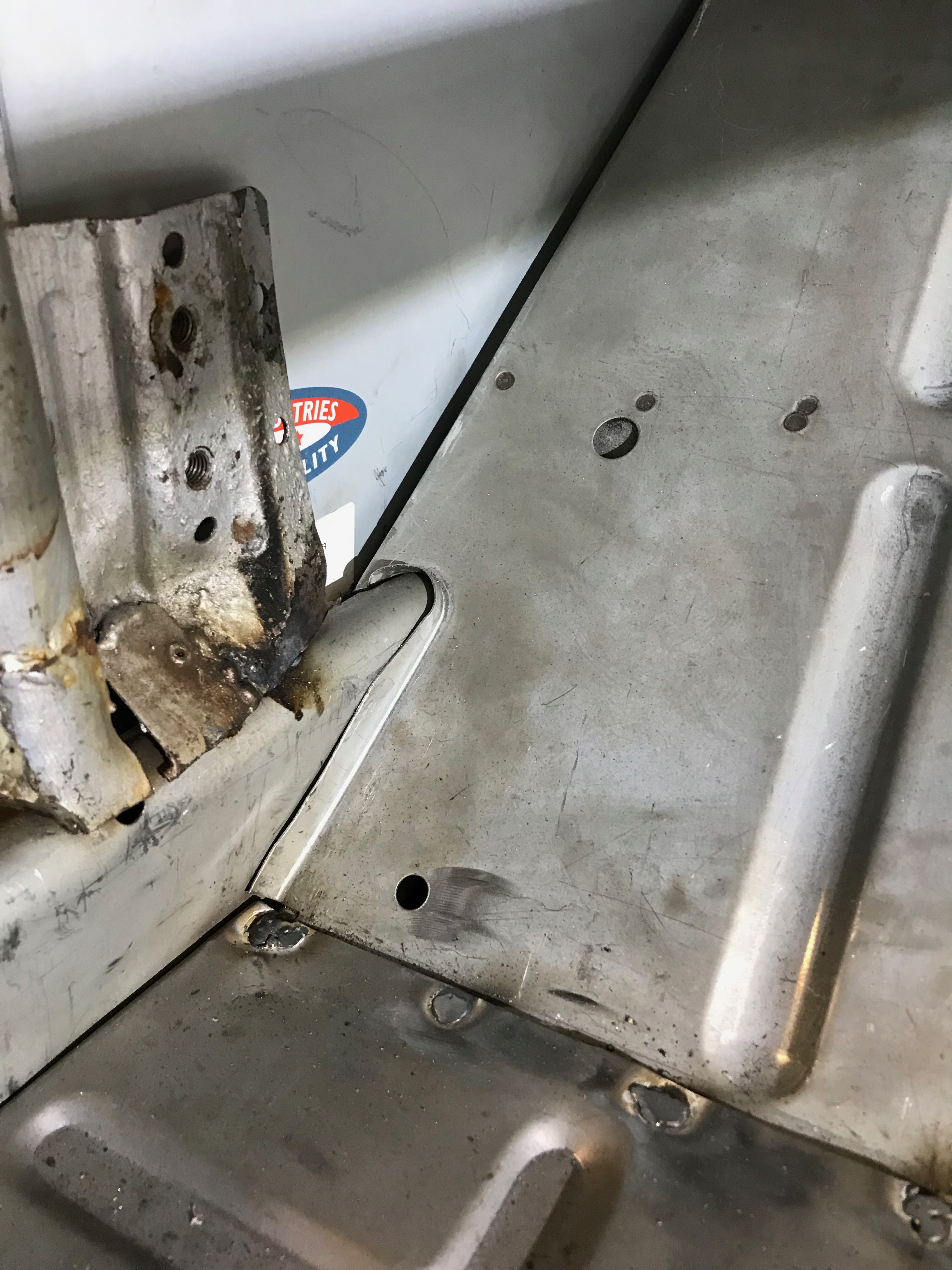Lastly, I dressed the join where the sill slots into the toe board and have seam welded it. This was tricky to weld and turned out a bit ‘blobby’ where I attempted to run a nice fillet along the join. There’s a big gap here, it would not have welded very well ‘as’ is’