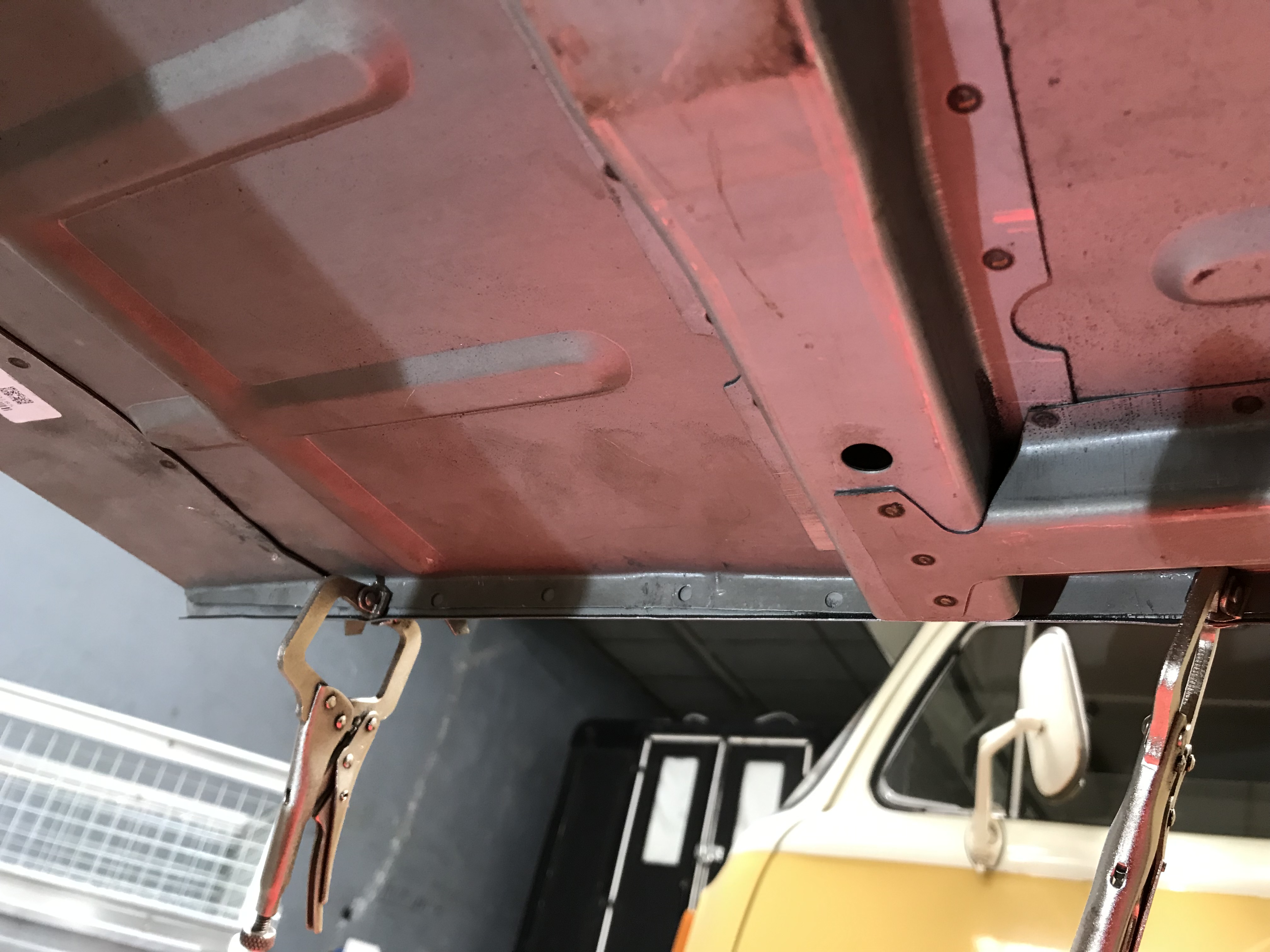Time to tackle the botton of the A posts where they meet the sills. It’s all pretty grotty down at there on both sides of the van, probably because unless this area is closed off from the elements where the sills slot into the the toe board, water will get in rust will be the result. First job is to tack the sills in place, so that I have something from which to measure the A post repair section from. Underneath the van, here’s were the floors join the sills. I punched holes in the floor flange and just made a few plug welds to hold it all in place.